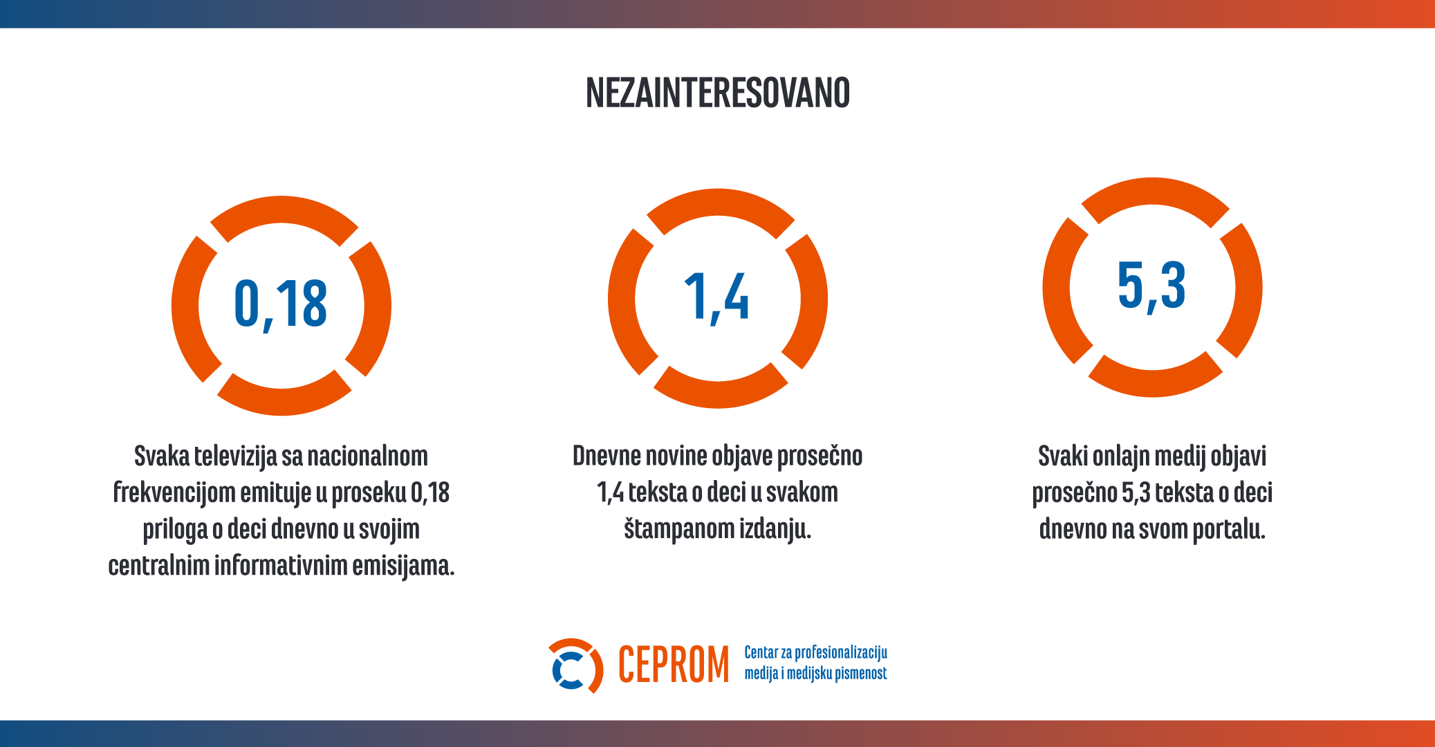 O nezainteresovanosti medija za ovu društvenu grupu najbolje svedoči podatak da svaka televizija sa nacionalnom frekvencijom u svojim centralnim informativnim emisijama prilog o deci emituje u proseku tek svakog petog dana (0,18 priloga po televiziji dnevno), dok dnevne novine objave prosečno 1,4 teksta po izdanju. Neograničen prostor na portalima rezultirao je prosekom od 5,3 teksta po onlajn mediju na dnevnom nivou, ali veći broj objava u štampi i na portalima ne podrazumeva i bolju situaciju u odnosu na televiziju jer njihov sadržaj ukazuje na mnogo ozbiljnije probleme od nezainteresovanosti za decu kao temu.
