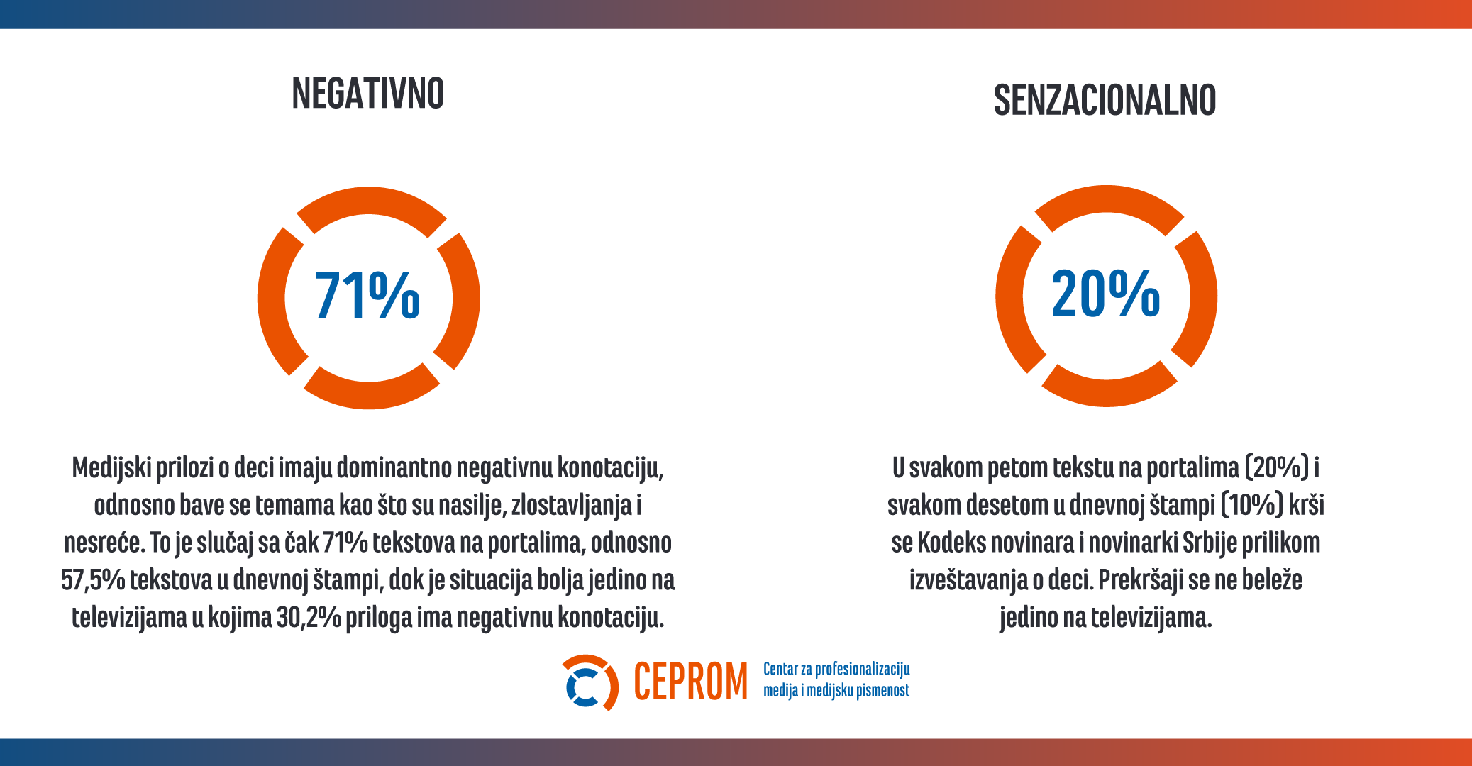 Čak 71% tekstova o deci u onlajn medijima ima negativnu konotaciju, kao i 57,5% u dnevnoj štampi, što znači da su zlostavljanja dece, nesreće, nasilje i razni incidenti po pravilu teme kojima mediji daju prioritet. Situacija je nešto bolja samo u slučaju televizija u kojima nešto manje od trećine priloga čine oni sa negativnom konotacijom, tačnije 30,2%. Uspesi i dostignuća dece istovremeno se svode praktično na nivo statističke greške, posebno na portalima i u dnevnoj štampi, što stvara izuzetno nezdravu medijsku klimu koja ima negativan uticaj i na decu i na njihovu percepciju u javnosti.