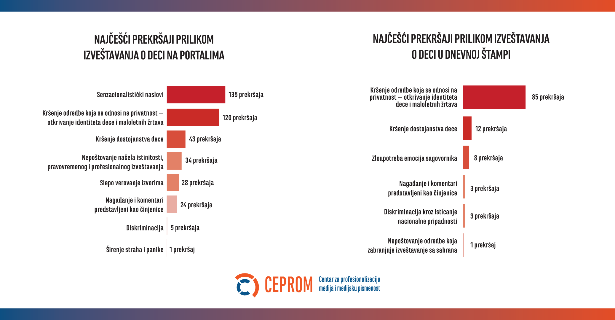 Otkrivanje identiteta dece, povreda privatnosti, nepoštovanje dostojanstva i objavljivanje senzacionalističkih sadržaja najčešći su prekršaji Kodeksa novinara i novinarki Srbije prilikom izveštavanja o deci. Senzacionalističko izveštavanje posebno je uočljivo u slučaju portala u kojima se deca najčešće koriste kao „mamac” jer se svaki incident koji uključuje decu iskoristi kao povod za priču zbog posebne osetljivosti publike prema ovoj društvenoj grupi.