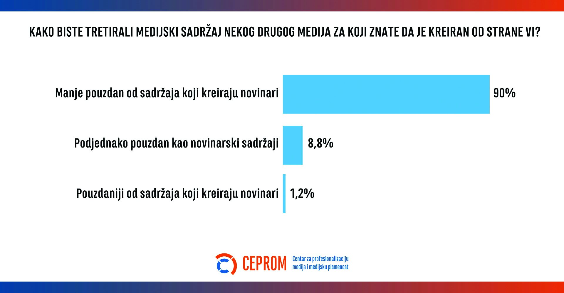 Kada je reč o označavanju sadržaja nastalog uz pomoć VI, u okviru istraživanja CEPROM-a na pitanje da li biste podržali uvođenje univerzalnog simbola koji bi označavao takav sadržaj 64% je odgovorilo potvrdno jer bi to „doprinelo većoj transparentnosti i poverenju publike”.