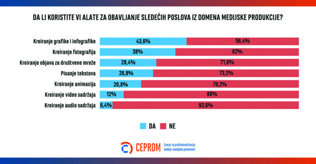 Mediji u Srbiji, sudeći prema istraživanju Centra za profesionalizaciju medija i medijsku pismenost CEPROM, alate generativne veštačke inteligencije koriste mnogo više za ilustraciju sadržaja, odnosno multimedijalne formate, nego za samo pisanje tekstova.