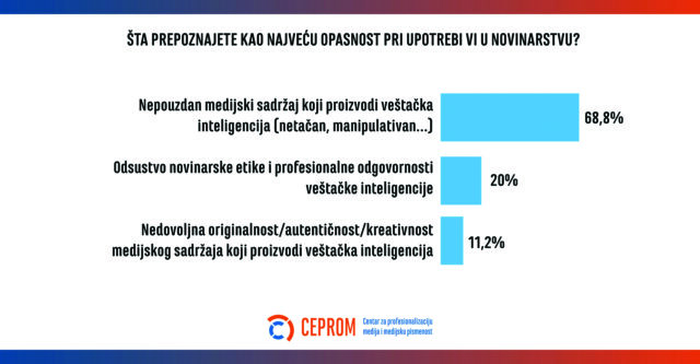 Čini se da su srpski novinari, bar kada ih pitate, vrlo svesni nedostataka VI, jer njih 68,8% kao najveću opasnost vidi nepouzdanost veštačke inteligencije, njenu netačnost i potencijalno manipulativni karakter, dok 20% smatra da je najveći problem u osustvu novinarske etike. Na prvi pogled reklo bi se da su urednici i novinari posle nekoliko godina prisustva VI u praksi, postali svesni prednosti, ali i mana sve brojnijih alata veštačke inteligencije i da su prevazišli početni strah ili pak oduševljenje koji prate svaku digitalnu novost pogotovo kada je ona ovakvih „dimenzija”.