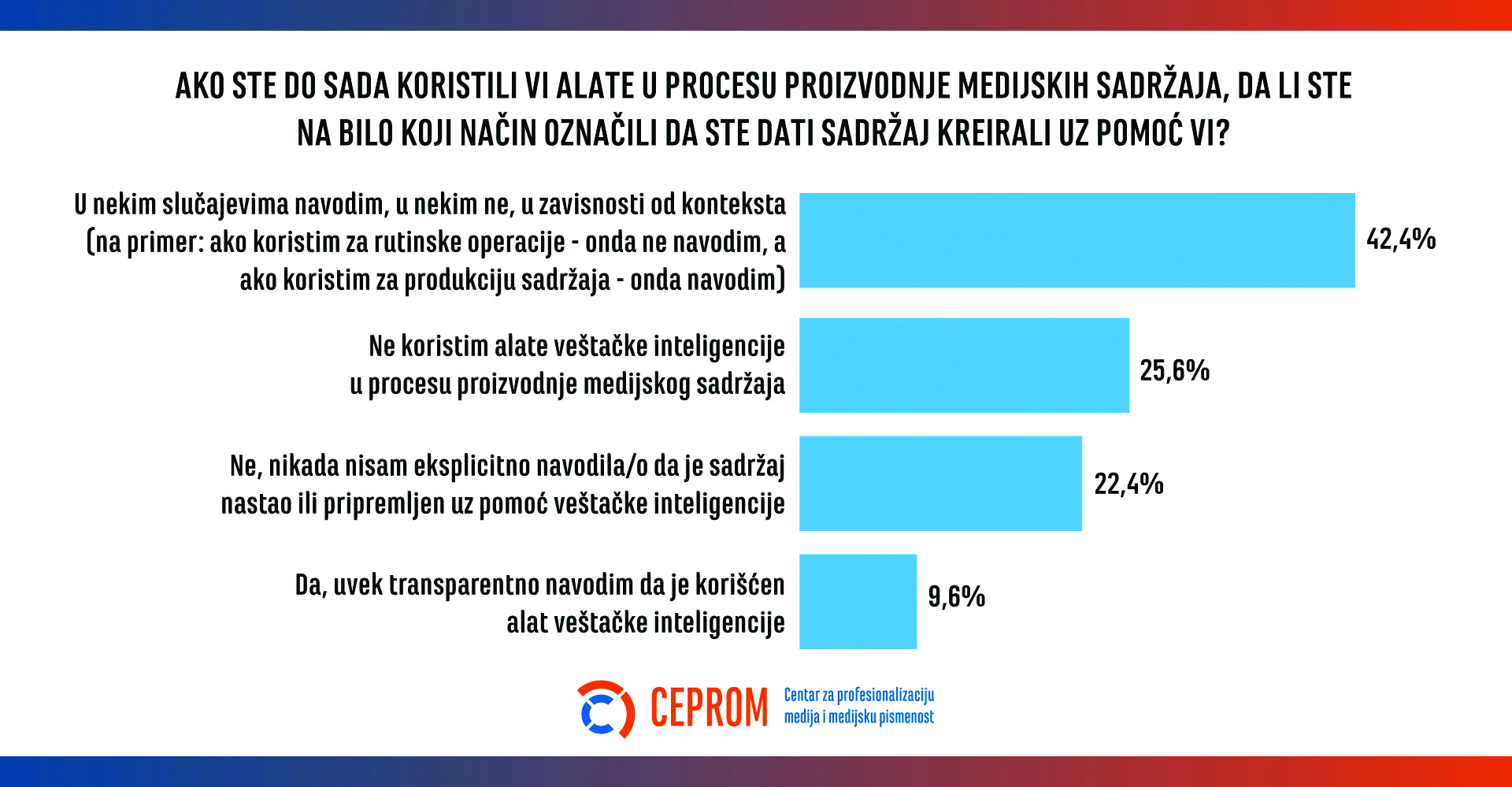 Istraživanje CEPROM-a pokazalo je da urednici i novinari dominantno podržavaju ideju označavanja sadržaja generisanog veštačkom inteligencijom jednim univerzalnim simbolom zarad transparentnosti i dobijanja poverenja publike.