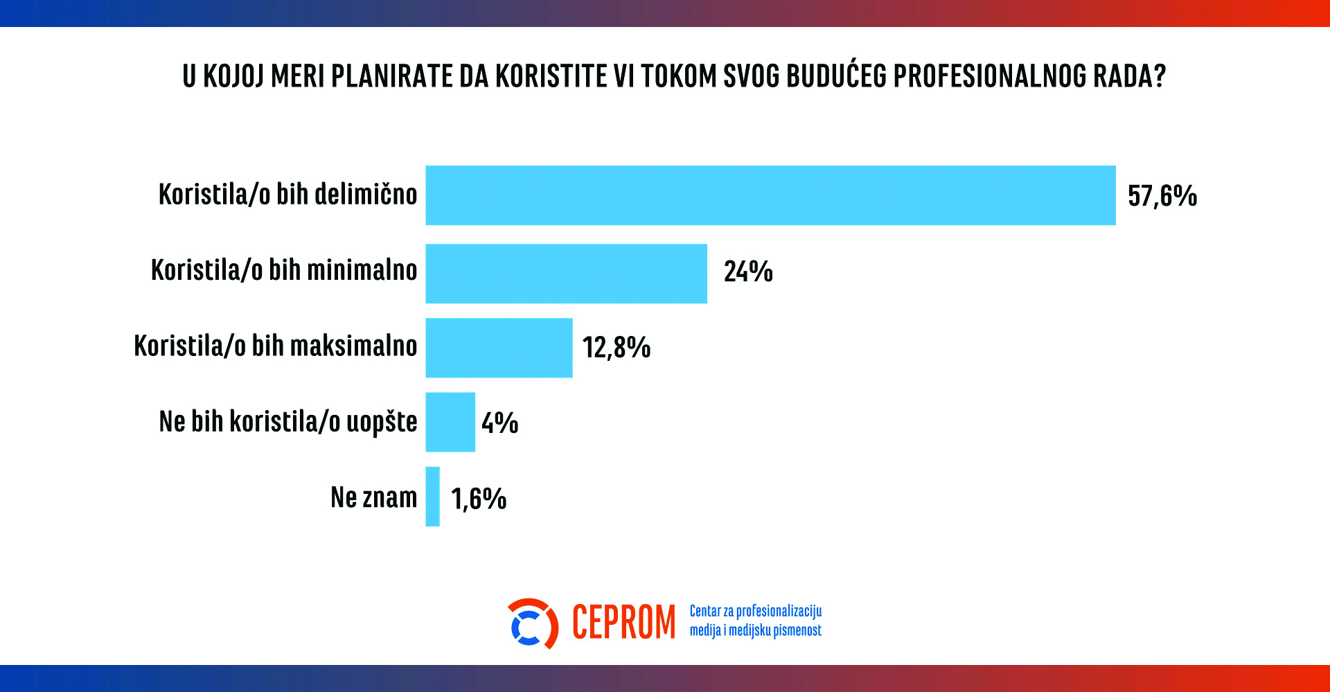 Najveći broj ispitanika (84,8%) već uveliko koristi VI u obavljanju svakodnevnog novinarskog posla, najčešće jednom u dva do tri dana. Skoro polovina njih, preciznije 48%, smatra da veštačka inteligencija već ima veliki uticaj na novinarstvo, ali su podeljeni po pitanju vrednovanja tog uticaja, pa isti procenat, odnosno 32%, smatra da VI ima pozitivan, ali i negativan uticaj. Ipak urednici i novinari su gotovo saglasni po bar dva osnova: prvo, da VI ne može u potpunosti i na profesionalan način da zameni novinare (92,8%), a drugo, da može biti koristan asistent novinarima, prevashodno u obavljanju dnevno rutinskih poslova, od prevođenja, pretrage i tagovanja, preko distribucije sadržaja do publike, do medijske produkcije, najčešće kreiranja vizuala, i to uglavnom za društvene mreže.